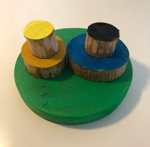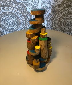 Example of a Tricky Tree build.Using the round base provided player or players can use there game pieces anywhere space provides.Game pieces can overhang the base. Small game pieces (smalls)can be separated when playing Tricky Tree.If a player knocks down a section of Tricky Tree they are out and remaining players can continue to build onto what remains.Or the player previously out can try to roll back in.If a player can guess there roll when it’s there turn they are back in the game and must play the game piece rolled. Tricky Tree can be played cooperative or competitive.Use all game pieces and you have made a TrickoryTree.